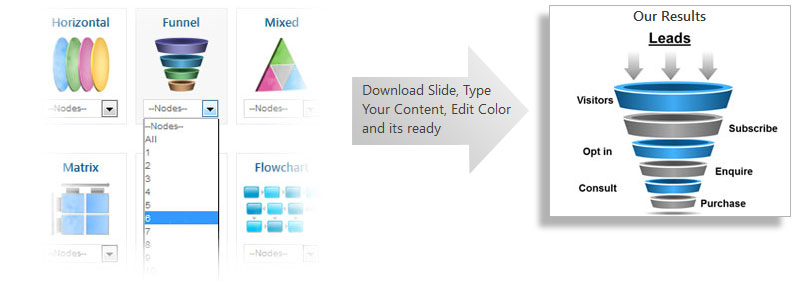 Select the graphic that represents your message the best, download it and add your text. For example, say you want a 6 piece funnel. Select Shape and Number of Nodes from drop down -